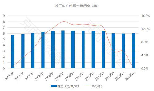 2)租金:二季度廣州全市甲級寫字樓租金達(dá) 6.0 元/㎡/天,與一季度持平;