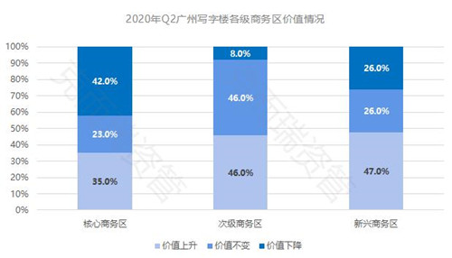 廣州各商務(wù)區(qū)價值表現(xiàn)分化,其中,核心商務(wù)區(qū)的寫字樓項目有 42% 的項目資產(chǎn)價值下降, 35% 的項目資產(chǎn)價值上升,表現(xiàn)分化,主要由于部分核心商務(wù)區(qū)項目采取以價換量的措施,以提升項目出租率。次級商務(wù)區(qū)整體表現(xiàn)穩(wěn)中有升,其中 46% 項目資產(chǎn)價值保持穩(wěn)定, 46% 項目資產(chǎn)價值上漲,此外有 8% 的項目資產(chǎn)價值下降。