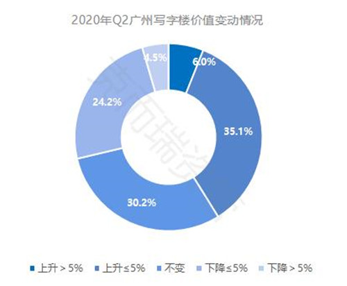 廣州市場整體供需均衡,產(chǎn)業(yè)結(jié)構(gòu)合理,表現(xiàn)出較強(qiáng)的韌性,寫字樓項目資產(chǎn)價值保持穩(wěn)定,其中,近 90% 的項目資產(chǎn)價值變動幅度不超過 5% ,項目資產(chǎn)價值保持不變的項目占比 30.2% ,上升幅度不超過 5% 的項目占比 35.1% ,下降幅度不超過 5% 的項目占比 24.2% 。