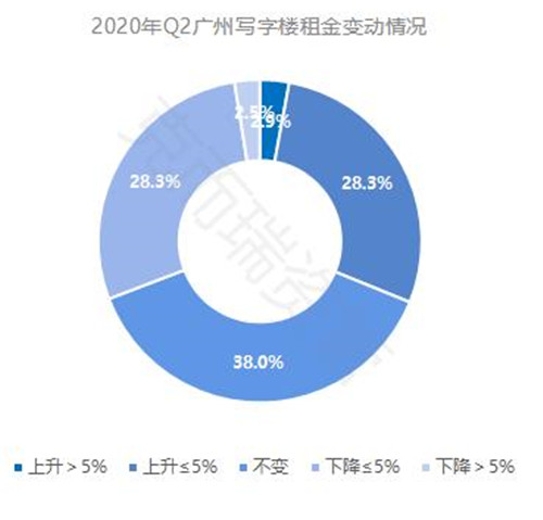約 28% 的項目租金微漲,但漲幅未超過 5% ;另外有 38% 的項目租金保持不變;而 3% 的項目租金降幅已超過 5% ,部分項目由于其區(qū)位和租戶的特殊性,受線下廣交會取消影響顯著,大量以展會、臨時辦公的外貿(mào)公司退租,致使其租金大幅度下降。此外,受疫情影響,大量項目將于下半年集中入市,預(yù)計下半年廣州寫字樓市場租金將進(jìn)一步承壓。