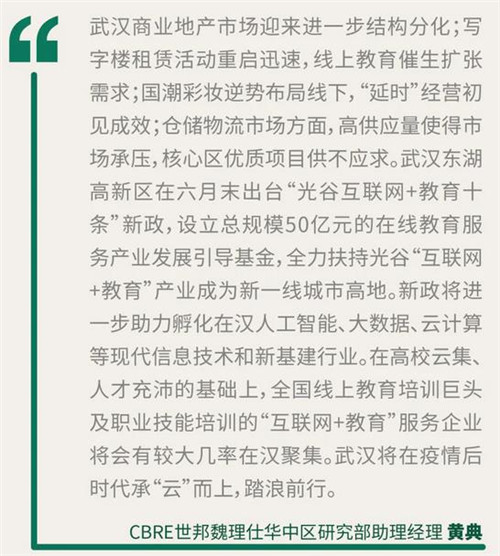 “展望未來六個月,由于復(fù)工復(fù)產(chǎn)的效率逐步提升,預(yù)計有近30萬平方米新增供應(yīng)將在年末逐步交付使用。其中位于光谷中心城的國采中心將會在三季度入市。隨著產(chǎn)業(yè)扶持政策的陸續(xù)出臺,互聯(lián)網(wǎng)行業(yè)中線上教育會進一步擴張!