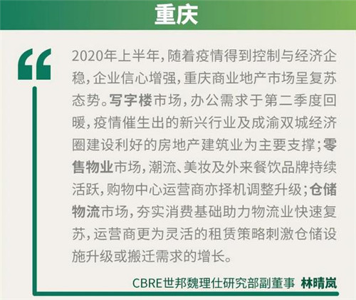 展望未來,下半年重慶還將迎來逾31萬平方米的新增供應(yīng)。隨著下半年經(jīng)濟(jì)走勢(shì)逐漸明朗,內(nèi)資中大型企業(yè)及本地中小微企業(yè)的辦公需求有望持續(xù)回升,但由于宏觀環(huán)境不明確性猶存,成本控制仍將貫徹全年,辦公需求將視企業(yè)發(fā)展周期、運(yùn)營情況而繼續(xù)在不同區(qū)域或辦公載體間流動(dòng)。