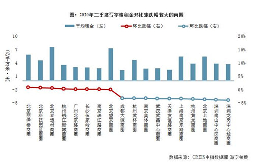 2020年二季度,新冠肺炎疫情對(duì)寫字樓市場的影響繼續(xù)顯現(xiàn),在中國房地產(chǎn)指數(shù)系統(tǒng)寫字樓租金指數(shù)監(jiān)測的15個(gè)重點(diǎn)城市主要商圈中,近九成商圈寫字樓租金環(huán)比下跌;其中批發(fā)零售、住宿餐飲、交通運(yùn)輸、文體娛樂等行業(yè)受到的影響較大,這幾類行業(yè)企業(yè)較為集中的商圈寫字樓租金環(huán)比下跌較多。在寫字樓租金環(huán)比下跌的商圈中,深圳龍崗中心城環(huán)比跌幅最大,為3.96%,租金下跌至3.7元/平方米·天;深圳南山中心區(qū)、北京上地等13個(gè)商圈寫字樓租金環(huán)比跌幅亦在3.0%以上;廣州體育中心、上海五角場等47個(gè)商圈租金環(huán)比跌幅在1.0%-3.0%之間;上;春V新、成都春熙路等9個(gè)商圈寫字樓租金環(huán)比跌幅在1.0%以內(nèi)。