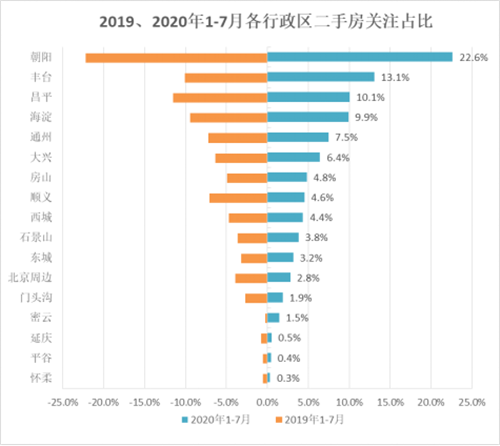 從行政區(qū)上看,今年1-7月,朝陽、豐臺、昌平的二手房關(guān)注熱度高,位居全市前三,關(guān)注占比分別為22.6%、13.1%、10.1%。關(guān)注熱度較低的為遠(yuǎn)郊區(qū)的懷柔(0.3%)、平谷(0.4%)、延慶(0.5%),關(guān)注熱度低于北京周邊(2.8%)。