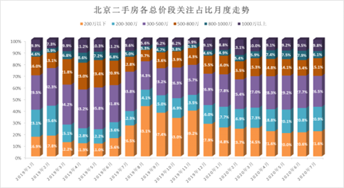 從總價段上看,購房者關(guān)注的總價段集中在300-500萬,但該總價段占比呈現(xiàn)下滑趨勢,根據(jù)數(shù)據(jù)顯示,2020年7月,300-500萬的總價段關(guān)注占比為26.5%,環(huán)比下降1.2個百分點,同比下降7.3個百分點。