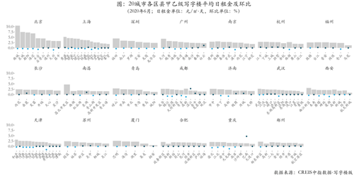 6月,20城市各商圈的甲乙級寫字樓平均日租金為3.00元/㎡·天,同環(huán)比分別為-4.79%和-0.12%。