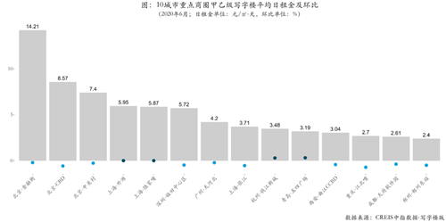 6月,北京甲乙級寫字樓日租金位列20城最高,達(dá)7.19元/㎡·天,合肥最低,為1.76元/㎡·天,廈門、福州同比微漲。