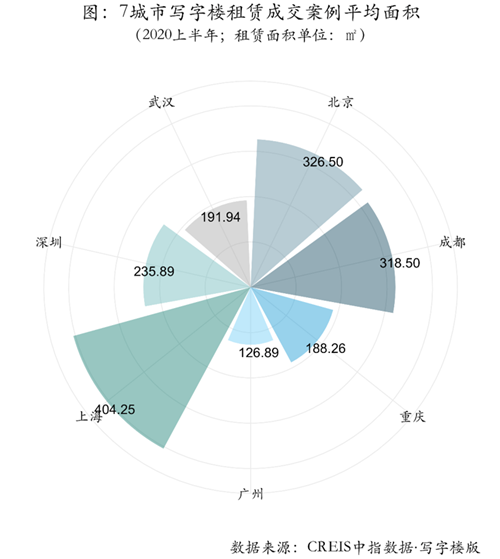 面積:上半年,上海成交寫字樓案例的平均面積最大,達(dá)到404.25㎡,其次為北京和成都,分別為326.50㎡和318.50㎡,武漢、重慶平均面積分別為191.94㎡和188.26㎡,最小的為廣州,為126.89㎡。