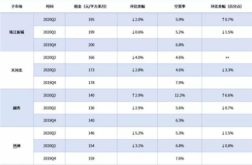值得注意的是,第二季度,越秀子市場甲級寫字樓空置率在上升的同時(shí),其租金水平也在升高,在幾個(gè)子市場中獨(dú)樹一幟。這是因?yàn)樾氯胧械男清緡H商業(yè)中心的租金水平在越秀子市場中相對較高,把該子市場的租金水平拉高。此外,琶洲租金跌幅相對最大,與未來該片區(qū)有大量新增供應(yīng)有關(guān)。