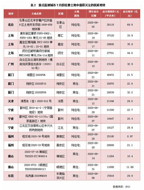除京、滬兩城因樓板價普遍較高(大都超1萬元/平方米外)使得優(yōu)質(zhì)地塊占比指標(biāo)相對較高外,其余城市中廈門、福州、佛山、武漢、寧波、成都、長沙、南寧、天津、紹興等10個城市優(yōu)質(zhì)地塊占比也相對較高,均在3成以上。其中,福州和廈門的比例都達(dá)到了100%,福州7月供應(yīng)7宗宅地,分別位于鼓樓、晉安、倉山區(qū),其中有4宗起拍價均在10億元,其余三宗起拍單價均在1.3萬元/平方米,其中位于鼓樓區(qū)的榕宗地2020-38號地塊采用“限地價、控房價、競自持社會租賃住房建筑面積”方式出讓,起始價9700萬元,起拍單價超2.5萬元/平方米,最高限制價格12700萬元,盡管面積較小,但由于區(qū)位優(yōu)越、配套完善,競拍之激烈可以預(yù)見。