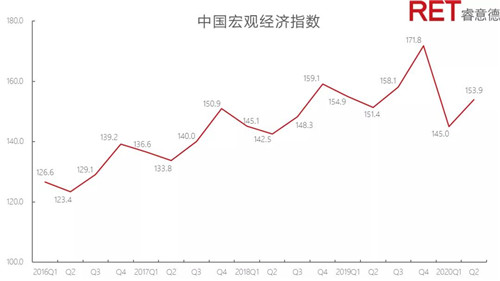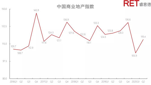 2020年第二季度,中國商業(yè)地產(chǎn)指數(shù)環(huán)比顯著增長,同比回落幅度收窄。伴隨著總體經(jīng)濟(jì)穩(wěn)步復(fù)蘇,實(shí)體商業(yè)也迎來消費(fèi)回暖趨勢。