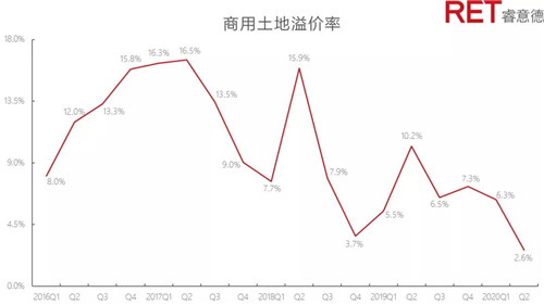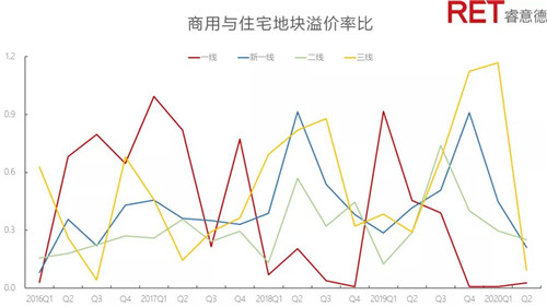 商辦土地樓面價同比下降3.3%,環(huán)比上升34.5%。除三線城市外,其余監(jiān)測城市樓面價較上一季度均有所回升,新一線城市樓面價回升已超過去年同期水平。商辦土地平均溢價率同比下降74.1%,環(huán)比下降58.2%。商辦住宅溢價率比從第一季度的0.3下滑至本季度的0.1,表明商辦土地市場的活躍度相較于住宅土地市場更低。