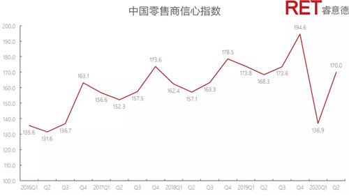 2020年第二季度,中國零售商信心指數(shù)為170.0,環(huán)比上漲24.2%,同比上漲1.0%。城鎮(zhèn)居民人均消費(fèi)支出6,007億元,同比下降6.2%。監(jiān)測類限額以上企業(yè)商品零售類值同比下降23.1%,環(huán)比下降10.0%。第一季度受疫情影響,購物中心營業(yè)店鋪數(shù)量縮減,而二季度品牌商店鋪批量重開是零售商信心指數(shù)增長的原因之一。