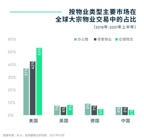 疫情爆發(fā)以來,國內(nèi)產(chǎn)業(yè)地產(chǎn)投資迅猛發(fā)展,在大宗交易金額中的占比目前已經(jīng)達到15%以上,但與全球平均約25%的比重相比仍有長足的增長潛力。從全球資本配置的角度我們也能得出相近的結(jié)論。根據(jù)RCA的數(shù)據(jù)統(tǒng)計,2016年至今中國的物流地產(chǎn)交易額僅占全球4%;該比例也低于中國辦公樓和零售物業(yè)在全球大宗交易額的占比。