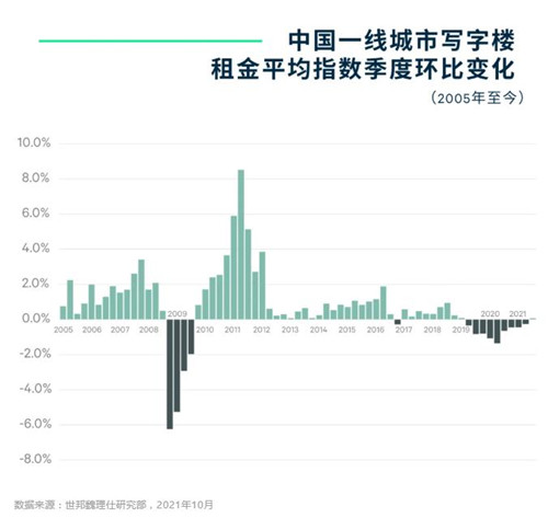 2021年三季度,盡管受到小規(guī)模疫情爆發(fā)和臺風汛期等因素的影響,中國商業(yè)地產(chǎn)租賃需求加速反彈。寫字樓、零售物業(yè)和倉儲物流的當季凈吸納量分別較去年同期大幅增長78%、151%和68%。更為重要的是,三大物業(yè)類型今年前三季度累計需求均已突破上一輪市場周期的同期高點。上一次市場出現(xiàn)相同的信號要追溯到2010-2011年,此后中國商業(yè)地產(chǎn)市場全面進入新一輪的增長周期。
