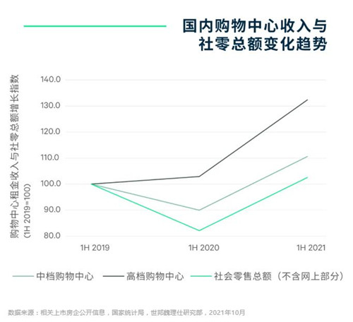 與寫字樓相比,運營溢價在購物中心投資中的作用更為凸顯。CBRE對數(shù)家上市房企零售物業(yè)經(jīng)營數(shù)據(jù)的分析顯示,今年上半年,具備強運營能力的房企所擁有的中端定位購物中心可比租金收入較2019年同期的平均上漲幅度達到10.6%;而受奢侈品銷售回流推動,高端購物中心的租金收入增幅超過30%,兩者均遠遠超出社會消費品零售總額的整體增長。