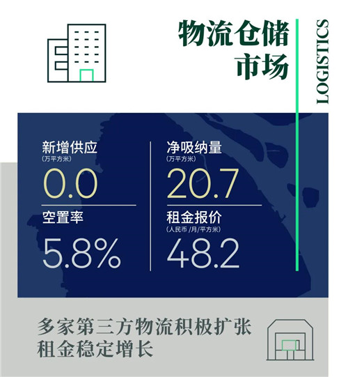 第三季度上海物流市場無新增供應(yīng)。第三方物流持續(xù)引領(lǐng)市場需求,松江、奉賢與金山分別錄得若干第三方物流公司的新租擴(kuò)租需求。隨著制造業(yè)與零售業(yè)高質(zhì)量發(fā)展,第三方物流也不斷打破地域限制,打造跨區(qū)域,多網(wǎng)點(diǎn)的縱深業(yè)務(wù)布局,成為倉儲(chǔ)物流強(qiáng)有力的支撐。同時(shí)隨著購物消費(fèi)節(jié)日的臨近,大型電商的需求增速回升,部分區(qū)域錄得短租成交。從區(qū)域來看,金山、奉賢季內(nèi)迎來大面積去化,季末全市空置率環(huán)比下降3.4個(gè)百分點(diǎn)至5.8%。在供不應(yīng)求且多個(gè)子市場長期保持滿租的狀態(tài)下,全市平均租金環(huán)比增長至每月每平方米48.2元。