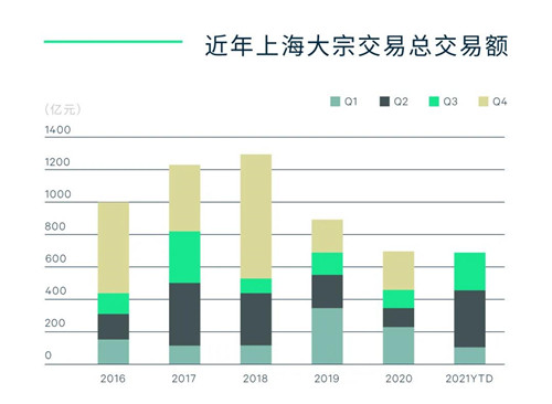 2021年第三季度,上海大宗交易市場繼續(xù)領(lǐng)跑全國,共錄得25筆交易,成交總額共計(jì)218.7億元。盡管單季金額環(huán)比下降,但年內(nèi)累計(jì)成交金額達(dá)678.0億元,已然接近去年全年交易水平,投資活躍度穩(wěn)中有升。