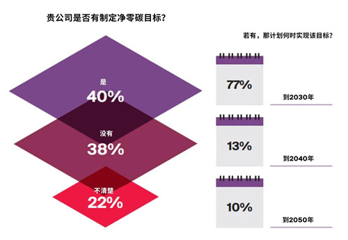 報(bào)告顯示,77%的受訪者都會設(shè)置一個公開的凈零碳目標(biāo),而且把目標(biāo)日期設(shè)定在2030年之前。