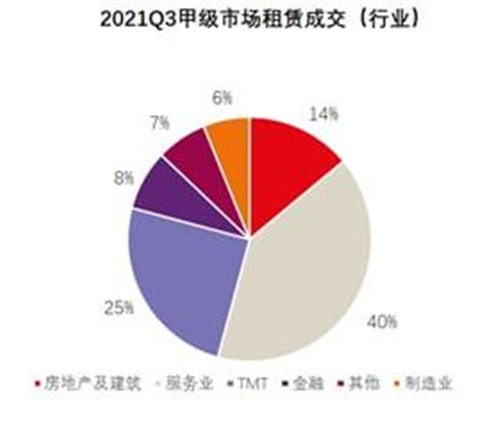 雙減政策對(duì)辦公樓市場(chǎng)產(chǎn)生一定影響,TMT行業(yè)以及服務(wù)業(yè)需求活躍。三季度末由于雙減政策的影響,前期擴(kuò)張較迅速的線上教育品牌租賃需求和活躍度均有下降,但服務(wù)業(yè)以及TMT行業(yè)市場(chǎng)活躍度繼續(xù)上升,其中,服務(wù)業(yè)企業(yè)占甲級(jí)市場(chǎng)三季度租賃成交量的40%,TMT企業(yè)占比25%,進(jìn)一步驅(qū)動(dòng)市場(chǎng)需求。值得關(guān)注的是,三季度在光谷和解放大道板塊錄得多個(gè)超過(guò)1,000平方米的成交,均來(lái)自于服務(wù)業(yè)以及TMT行業(yè)。