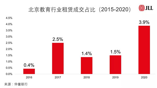 仲量聯(lián)行之前發(fā)布的《應(yīng)勢(shì)開新,重塑格局:2021中國(guó)辦公樓市場(chǎng)白皮書》顯示,北京辦公樓租金水平位列世界第三、中國(guó)大陸第一,在此我們選擇對(duì)北京市場(chǎng)進(jìn)行深度透視以窺一線城市全貌。2016年以來,教育行業(yè)在辦公樓市場(chǎng)上的擴(kuò)張需求逐漸顯現(xiàn),特別是2017年“直播”形式的出現(xiàn)帶動(dòng)在線教育企業(yè)呈規(guī);l(fā)展。但從整體占比來看,教育行業(yè)的占比遠(yuǎn)不及金融、科技等主力需求行業(yè),即使在2020年受疫情影響,在線教育企業(yè)因流量井噴而逆勢(shì)擴(kuò)張的情況下,教育行業(yè)在全年租賃成交中的占比也僅從2016年的0.4%增長(zhǎng)至3.9%,對(duì)整體辦公市場(chǎng)的影響較小。此外,教育企業(yè)在全市甲級(jí)及超甲級(jí)辦公樓中的實(shí)際入駐占比僅為4%,因此,今年政策趨嚴(yán)帶來的行業(yè)波動(dòng),對(duì)甲級(jí)及超甲級(jí)辦公樓市場(chǎng)的影響甚微。