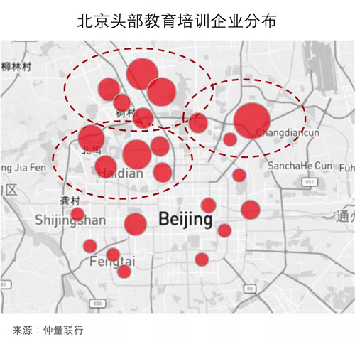 如果將甲乙級(jí)及更低品質(zhì)辦公樓物業(yè)、底商、商住等各種類型的辦公面積均考慮在內(nèi),“雙減”政策落地之前,教育行業(yè)在北京的總辦公租賃面積超60萬平方米,中關(guān)村、上地和望京是主要的教育企業(yè)聚集地。在這60萬平方米中,超過50%的面積并非作辦公用途,而是用作教育培訓(xùn)的教室。其中,新東方、學(xué)而思、作業(yè)幫等頭部10大企業(yè)約為27萬平方米,占比超過45%。