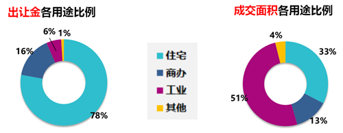 成交面積方面,各類用地供求結(jié)構(gòu)較穩(wěn)定,工業(yè)用地占比過半,住宅類用地成交面積占比為33%,較去年基本持平,其他用地占和去年基本相同。