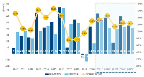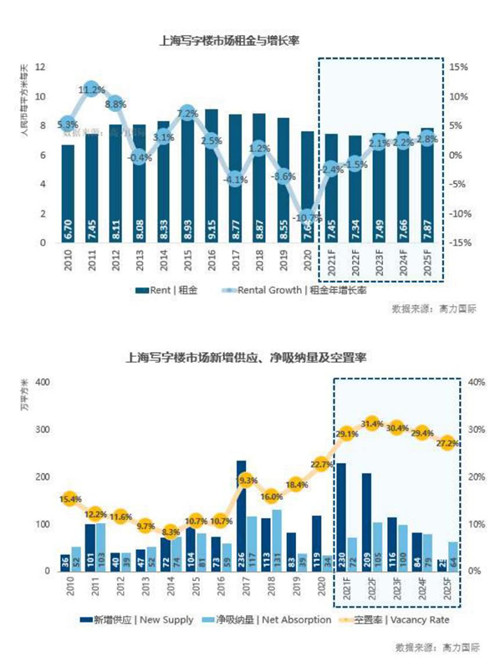 高力國(guó)際指出,2021-22年上海寫字樓新增供應(yīng)將迎來高峰,年均有超過200萬平方米的新增供應(yīng)量入市,將使市場(chǎng)空置率進(jìn)一步上揚(yáng),租金也將承受較大壓力,“以價(jià)換量”或?qū)⒊蔀槲磥韮赡贽k公樓租賃市場(chǎng)的主要策略。