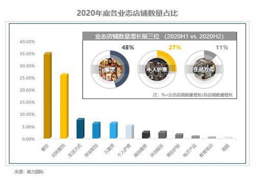 從業(yè)態(tài)來看,2020年下半年,餐飲,個(gè)人護(hù)理和生活方式的需求增長(zhǎng)明顯。截止2020年底,餐飲業(yè)態(tài)半年環(huán)比增加200多個(gè)店鋪,占比為36%,其需求上漲對(duì)整體市場(chǎng)的回暖起到重要影響。餐飲類品牌尤其是快餐、休閑餐飲 (如:7分甜,Tims,松鶴樓和湊湊)和潮流運(yùn)動(dòng)類品牌(如:adidas,MLB和FILA)回暖速度較快。