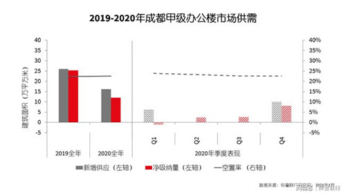 三、供應(yīng)方面,2020年成都甲級辦公樓新增供應(yīng)約16.1萬平方米。新入市項(xiàng)目為金融城板塊的天府國際金融中心以及市中心板塊的豐德成達(dá)中心。受疫情影響,業(yè)主方或因工程進(jìn)度延后、資本壓力或需求預(yù)期下行等因素調(diào)整項(xiàng)目入市時間。與2019年預(yù)測數(shù)值相比,延期率高達(dá)36%。但較低的新增供應(yīng)也使得在需求收緊的背景下,市場空置壓力所有減輕。在供需均較年初預(yù)期有所收窄的情勢下,2020年成都甲級辦公樓空置率并未出現(xiàn)明顯上升,僅同比小幅上升0.1個百分點(diǎn),至年末報22.5%。