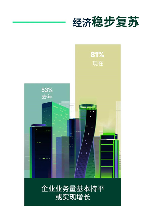 盡管各城市出現(xiàn)零星暴發(fā)的病例,但商務(wù)活動(dòng)整體表現(xiàn)穩(wěn)定并保有增長(zhǎng)勢(shì)頭。81%的受訪企業(yè)表示公司業(yè)務(wù)量相較疫情前水平已基本持平或?qū)崿F(xiàn)增長(zhǎng),該占比較2020年5月的租戶調(diào)查結(jié)果增長(zhǎng)28個(gè)百分點(diǎn)。
