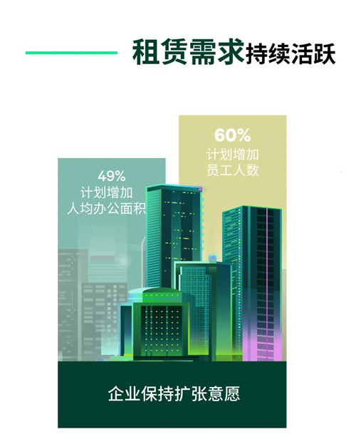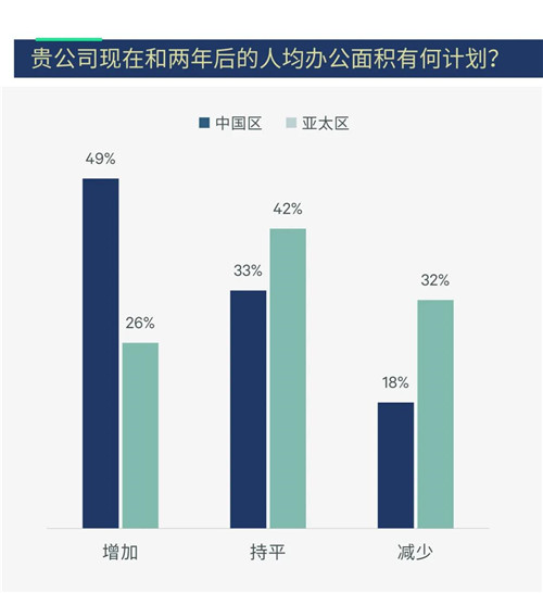 另一方面,疫情后,租戶考慮降低辦公室密度。不斷增長(zhǎng)空間需求也來(lái)源于疫情后企業(yè)對(duì)降低辦公室密度的考量。租戶調(diào)查顯示,49%的受訪企業(yè)計(jì)劃未來(lái)兩年增加人均辦公面積,遠(yuǎn)高于亞太區(qū)的平均水平。