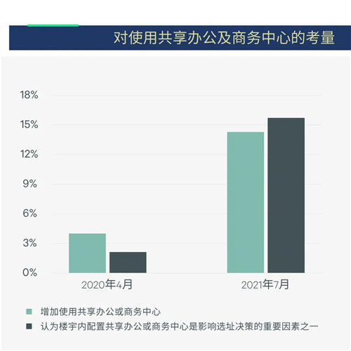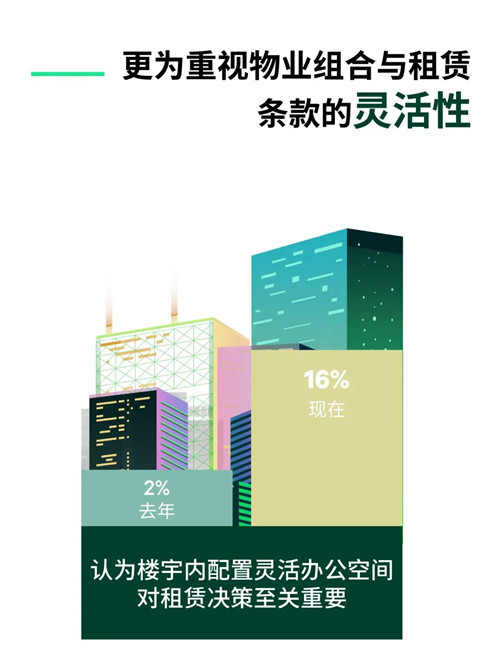 因此,租戶也期望以更靈活的資產(chǎn)配置方式支撐其靈活辦公模式。14%的受訪企業(yè)計(jì)劃未來(lái)增加共享辦公或商務(wù)中心的使用,另有16%的受訪企業(yè)認(rèn)為樓宇內(nèi)共享辦公或商務(wù)中心的配置是影響選址決策的重要因素。這兩項(xiàng)占比較一年前均有明顯提升。