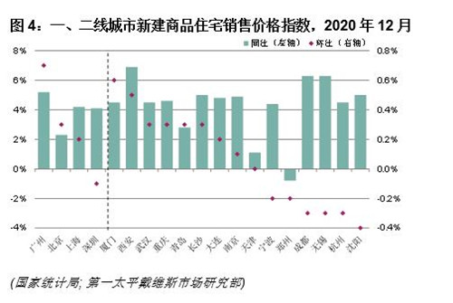 12月,全國70個(gè)大中城市新建商品住宅平均售價(jià)環(huán)比上漲0.123%,較11月的0.117%有所增加。平均售價(jià)較去年同期上漲3.73%,較指數(shù)設(shè)立基期(2010年12月)累計(jì)上漲53.27%。其中,42個(gè)城市的新建商品住宅售價(jià)錄得環(huán)比上漲,6個(gè)城市環(huán)比持平,22個(gè)城市環(huán)比下跌。