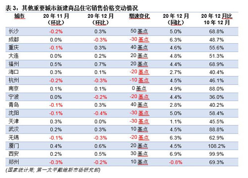 至年末住宅市場走勢(shì)趨于平淡, 12月各城價(jià)格漲跌幅度均未超過1%。一、二線城市基本錄得4-6%的同比增長,僅鄭州除外,價(jià)格低于上年同期水平。價(jià)格指數(shù)自2010年12月設(shè)立至今已滿10年,在此期間一線城市新建商品住宅價(jià)格實(shí)現(xiàn)翻番,二、三線城市平均漲幅分別在65%、53%。南區(qū)城市深圳(136%)、廈門(108%)、廣州(106%)的新建商品住宅價(jià)格均增長一倍有余。