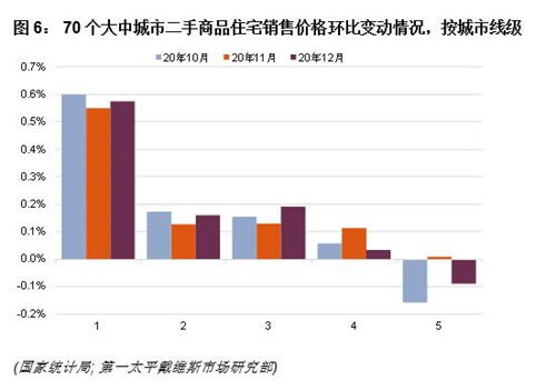 二手商品住宅價(jià)格走勢(shì)與一手市場類似,12月環(huán)比上漲0.12%。一線城市二手住宅市場表現(xiàn)仍舊優(yōu)于一手市場以及其他線級(jí)城市二手市場。二、三線城市價(jià)格增長有所提速,但幅度甚微。
