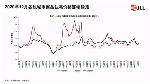 在價(jià)格方面,國(guó)家統(tǒng)計(jì)局?jǐn)?shù)字顯示,2020年12月份70個(gè)大中城市新建商品住宅銷售價(jià)格漲幅總體穩(wěn)定。12月份,4個(gè)一線城市新建商品住宅銷售價(jià)格環(huán)比上漲0.3%,漲幅比上月擴(kuò)大0.1個(gè)百分點(diǎn);二線和三線城市新建商品住宅銷售價(jià)格環(huán)比均上漲0.1%,漲幅均與上月相同。全年來看,一線城市新建商品住宅銷售價(jià)格同比上漲3.9%,二線和三線城市新建商品住宅銷售價(jià)格分別同比上漲4.0%和3.5%,漲幅均超過2019年。