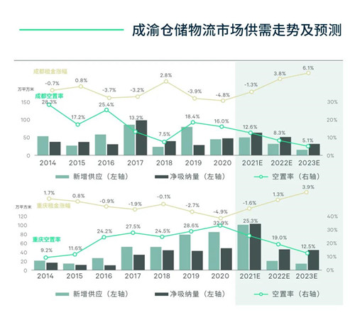 過(guò)去5年,供需兩旺、去化優(yōu)先是中國(guó)西部倉(cāng)儲(chǔ)物流市場(chǎng)的主流趨勢(shì)。然而2021年將是轉(zhuǎn)折之年,隨著供應(yīng)潮迎來(lái)尾聲,供需天平即將翻轉(zhuǎn),租金上行通道開(kāi)啟。同時(shí),“十四五”期間,中國(guó)作出以城市化和內(nèi)循環(huán)為核心的經(jīng)濟(jì)發(fā)展部署,在推進(jìn)西部大開(kāi)發(fā)形成新格局的背景之下,積極建設(shè)成渝雙城經(jīng)濟(jì)圈,成都、重慶繼而迎來(lái)新定位、新啟程。有鑒于此,成渝倉(cāng)儲(chǔ)物流市場(chǎng)也將隨之迎來(lái)波瀾壯闊的新格局和新機(jī)遇。