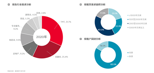 截至2020年第四季度,廣州甲級(jí)寫字樓市場(chǎng)空置率同比上升2.6個(gè)百分點(diǎn)至8.1%,為一線城市中最低。同時(shí),廣州租金的跌幅也最小,僅同比下降5.4%至180.4元每月每平方米。年初受新冠疫情影響,企業(yè)租賃意愿減弱,退租和空置增加;下半年企業(yè)搬遷意愿逐步增強(qiáng),業(yè)主普遍愿意提供更大的議價(jià)空間加速去化,多重因素刺激下市場(chǎng)活躍度有所上升。但是企業(yè)搬遷仍以成本控制為主要考慮。受疫情和整體經(jīng)濟(jì)環(huán)境影響,外資租戶活動(dòng)有所放緩,年以內(nèi)資租戶主導(dǎo)市場(chǎng)需求。TMT和金融業(yè)為全年兩大主力需求來源,占比分別高達(dá)32%和25%。