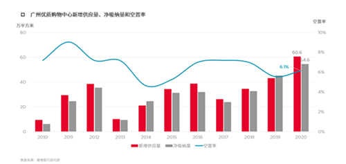 回顧2020全年,在度過前兩季度的低迷之后,隨著疫情的控制,廣州優(yōu)質(zhì)購物中心市場(chǎng)逐步回暖,展現(xiàn)強(qiáng)勁勢(shì)頭。在新增供應(yīng)達(dá)十年高峰至60.6萬平方米的情況下,吸納量同時(shí)攀升至54.6,亦達(dá)十年之最。新項(xiàng)目良好的招商進(jìn)展及年底前商家積極拓店擴(kuò)張是實(shí)現(xiàn)吸納高峰的主因。截至第四季度,新增供應(yīng)量小幅推動(dòng)空置率上升0.6個(gè)百分點(diǎn)至6.1%,全市租金結(jié)構(gòu)性同比下降3.6%。