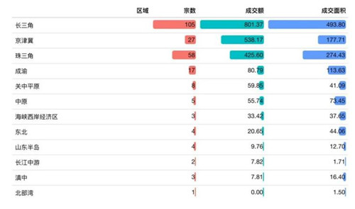 ◆京津冀:宗數(shù)占比38.28%,成交額21.34%,成交面積13.75%。