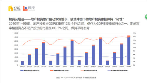 結合地產(chǎn)市場表現(xiàn)來看,地產(chǎn)投資累計值已恢復增長,疫情沖擊下的地產(chǎn)投資依舊保持“韌性”。2020年1-4季度,地產(chǎn)投資占GDP比重在12%-16%之間,仍作為GDP主要貢獻行業(yè)之一。期間寫字樓投資占不動產(chǎn)投資的比重在4%-5%之間,保持平穩(wěn)態(tài)勢。