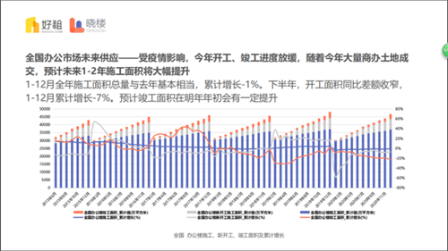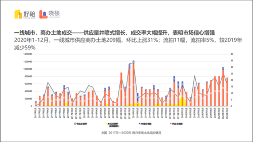 一線城市商辦土地成交供應量井噴式增長,成交率大幅提升,表明市場信心增強。2020年1-12月,一線城市供應商辦土地209幅,環(huán)比上漲31%;流拍11幅,流拍率5%,較2019年減少59%。另受疫情影響,2020年開工、竣工進度放緩,隨著大量商辦土地成交,預計未來1-2年施工面積將大幅提升。全年施工面積總量與上年基本相當,累計增長-1%,竣工面積預計在2021年年初會有一定提升。此外,1-12月辦公樓累計銷售3334萬㎡,累計銷售額5047億元,辦公一級市場信心回升,量價逐步恢復。