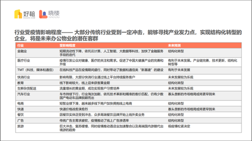 曉樓報告還指出,行業(yè)受疫情影響程度不盡相同,大部分傳統(tǒng)行業(yè)受到一定沖擊,能夠尋找產(chǎn)業(yè)發(fā)力點,實現(xiàn)結構化轉型的企業(yè),將是未來辦公物業(yè)的潛在客群。其中,金融業(yè)短期流動性下降,依托云計算、人工智能、大數(shù)據(jù)等科技,加快了金融服務手段的迭代,TMT行業(yè)的在線科技產(chǎn)品在疫情期間盛行,同時帶動了數(shù)據(jù)和通信類“新基建”的建設。產(chǎn)業(yè)政策方面,中央將十四五規(guī)劃作為頂層指導戰(zhàn)略,各城市出臺細化政策落地執(zhí)行,產(chǎn)業(yè)升級迎來新機遇。