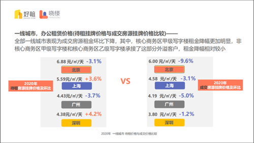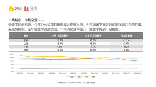 近日,大數(shù)據(jù)驅動的全價值鏈商辦運營平臺好租旗下曉樓數(shù)據(jù)服務平臺發(fā)布《2020年商辦市場研究報告》,重點監(jiān)測北上廣深四城,通過對量價、客需等多維度分析來解析商辦市場運行表現(xiàn)。報告顯示,隨2020年下半年經(jīng)濟復蘇,商辦市場下行趨勢放緩,北京上海等一線城市重點商圈空置率降幅均在年末收窄。在下游需求端,客戶對價格更加敏感,TMT行業(yè)仍為疫情防控期間的租金貢獻擔當。