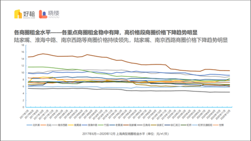 另從回暖表現(xiàn)來看,深圳在四個一線城市中尤為明顯:一是重點商圈空置率從2020年1月的最高值23.1%降至16.5%且自10月以來保持低位運行,二是1-3元/㎡/天的低價需求在下半年有所回落,市場承租能力分布大致已接近疫情前水平。