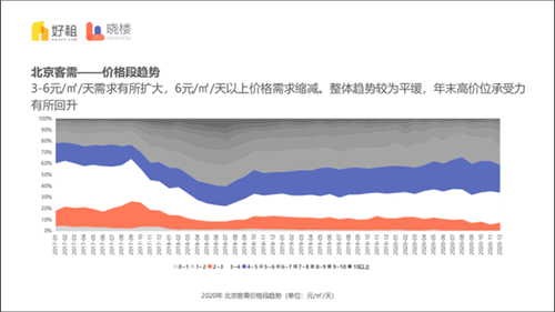 對比往年,北京各商圈租金均有下調。為了促進成交,通常以降租金、延長免租期等形式,達到變相優(yōu)惠的目的以促成交易。北京需求租金集中于3-6元/㎡/天,互聯(lián)網(wǎng)行業(yè)需求量遙遙領先,包括具有一定“防疫”概念的在線辦公、在線教育、在線醫(yī)療服務等企業(yè)得以擴張,有一定租賃需求。北京除了3-6元/㎡/天主力需求價格段有所擴大,6元/㎡/天以上價格需求縮減,整體趨勢較為平緩,年末高價位承受力有所回升。上海需求租金走勢與北京相仿,主力價格段2-5元/㎡/天中的3-4元/㎡/天需求比例提升,5元/㎡/天以上需求持續(xù)壓縮。