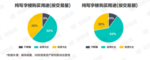 使用用途方面,盡管只有少部分買家披露,但可從買家性質(zhì)做簡單推斷,將投資、物管、房地產(chǎn)公司買家歸為以投資為主,剩余買家歸為以自用為主,以交易量來計算,純寫字樓中53%為自用為主、38%為投資為主。按交易額計,純寫字樓成交額中62%由自用為主買家貢獻(xiàn),28%來自投資為主買家。