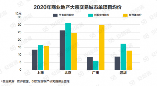 據(jù)58安居客房產(chǎn)研究院不完全統(tǒng)計,2020年全國共錄得208宗商業(yè)地產(chǎn)大宗交易,成交總額約1923億元,較2019年下降約3成。其中,純寫字樓合計成交項(xiàng)目68宗,占比33%;涉及交易金額約922億元,占比48%。商業(yè)綜合體成交項(xiàng)目23宗,成交總額332億元,成交額占比17%。無論從交易宗數(shù)還是交易額來看,寫字樓仍是商業(yè)地產(chǎn)大宗交易最受歡迎的物業(yè)類型。