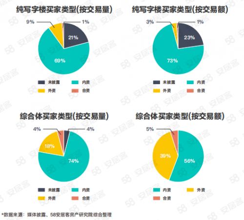 按交易額計,純寫字樓交易中內(nèi)資貢獻(xiàn)669億,占比73%,外資貢獻(xiàn)287億,占比3%;綜合體交易中內(nèi)資貢獻(xiàn)185億,占比56%,外資貢獻(xiàn)131億,占比39%。